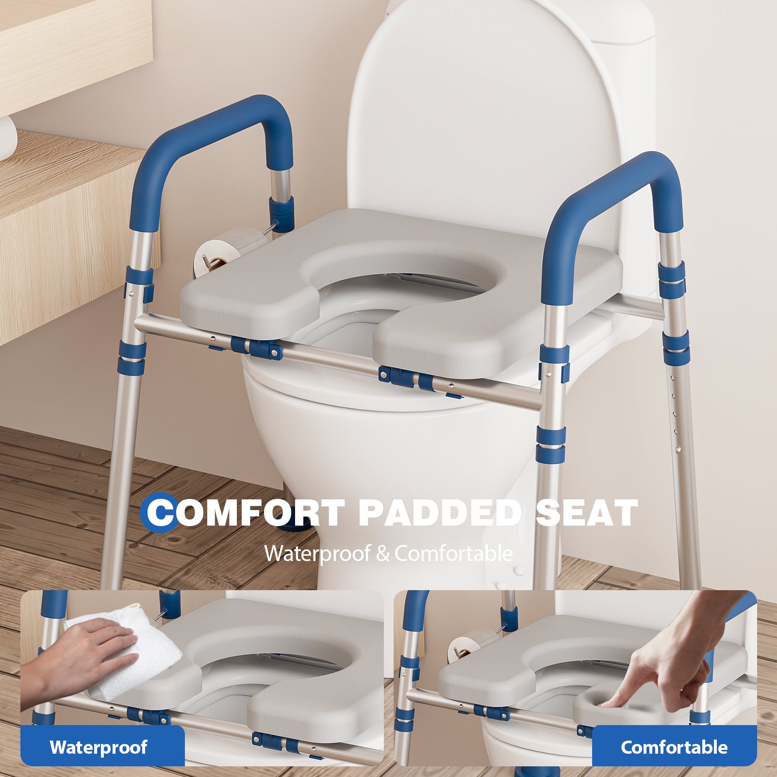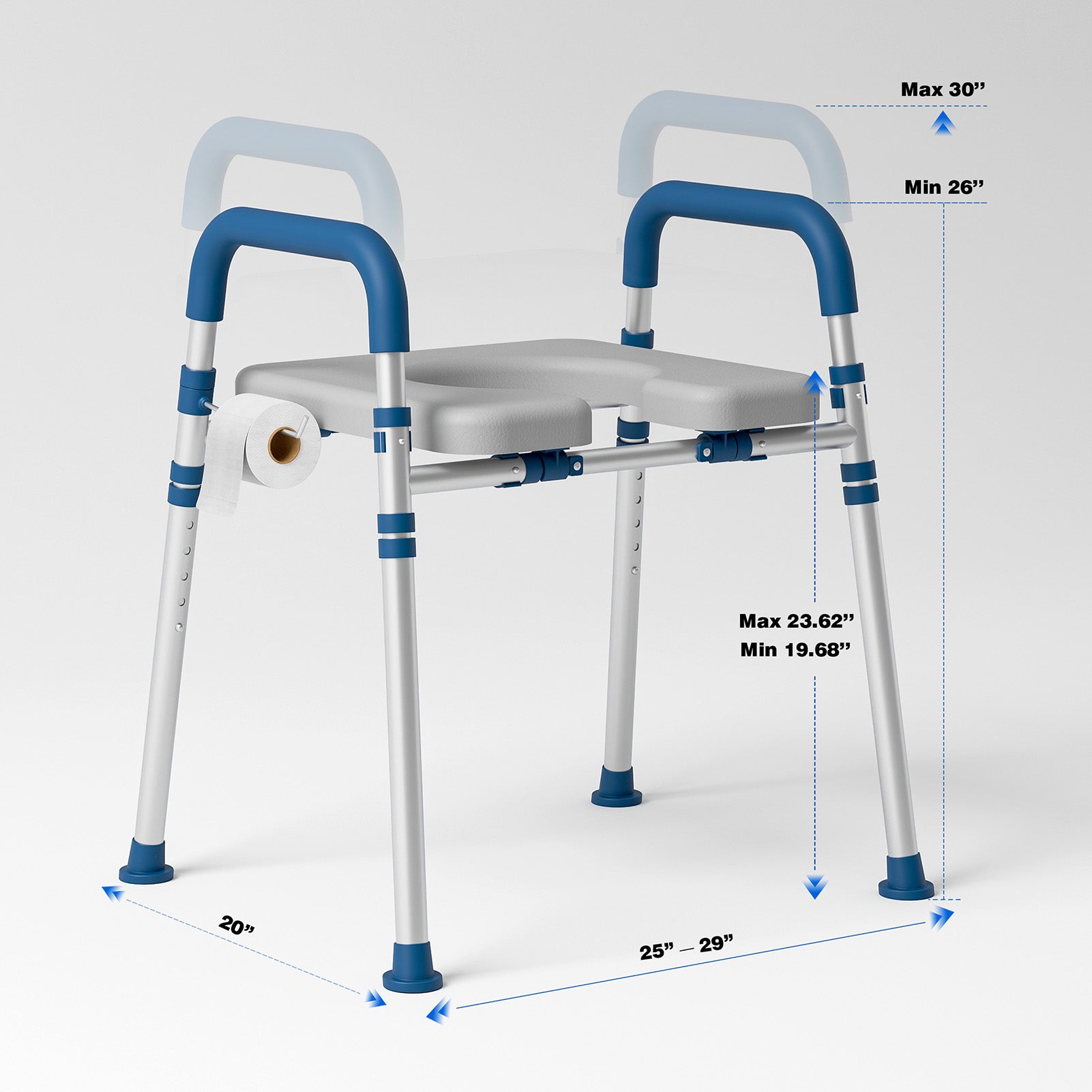 - Triple Adjustable Design : Customize seat height (19.68"-23.62"), handle height (26"-30"), and width (24.31"-30.31") to fit most of standard toilets. Ideal for seniors, post-surgery recovery, obesity, or pregnancy.