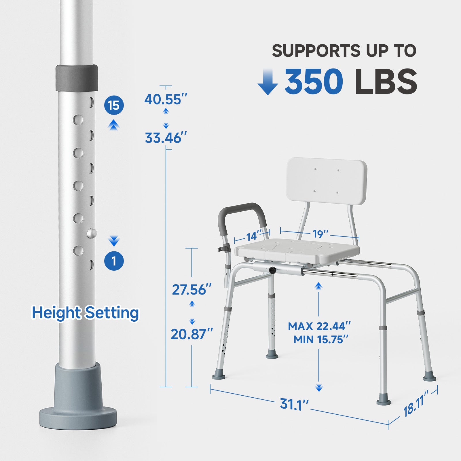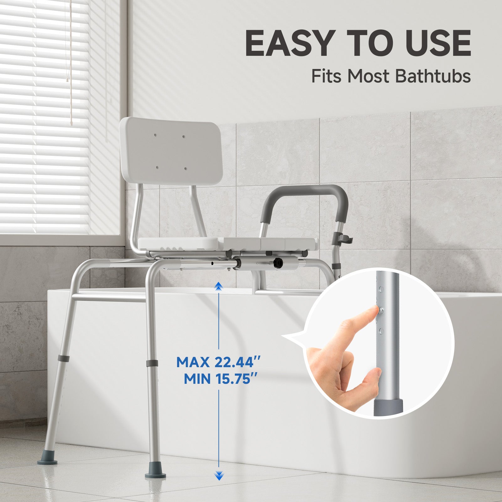 - Tool-Free Height Adjustment :Height adjustment range: 15.75"-22.4". Features one-handed lever operation requiring no tools, instantly adapting to deep Jacuzzi tubs or low bathtubs. Seat weight capacity: 350 lbs.